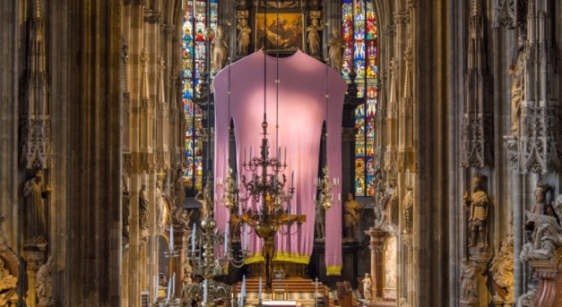 Óriási lila pulóvert húztak a bécsi Stephansdom oltárára.