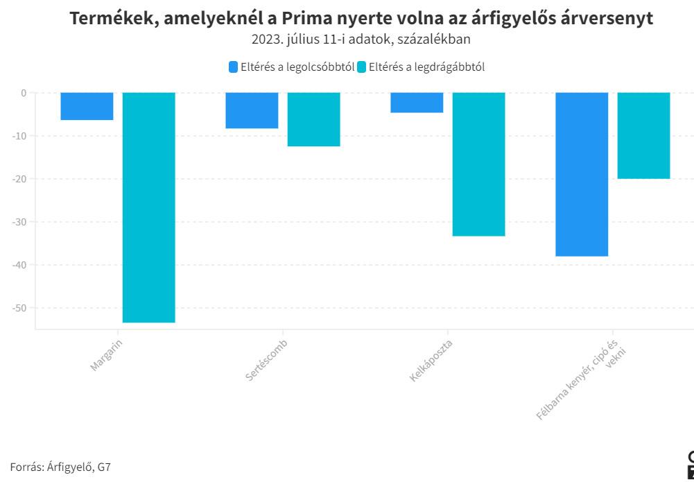 Az adott napon a Prima így összességében 51 termékből 30 esetében nem jött volna ki jól abból, ha a vásárlók az Árfigyelőben szúrós szemmel nézik az adatokat, és csak négy olyan termék volt, amellyen megnyerte volna az aktuális árversenyt.