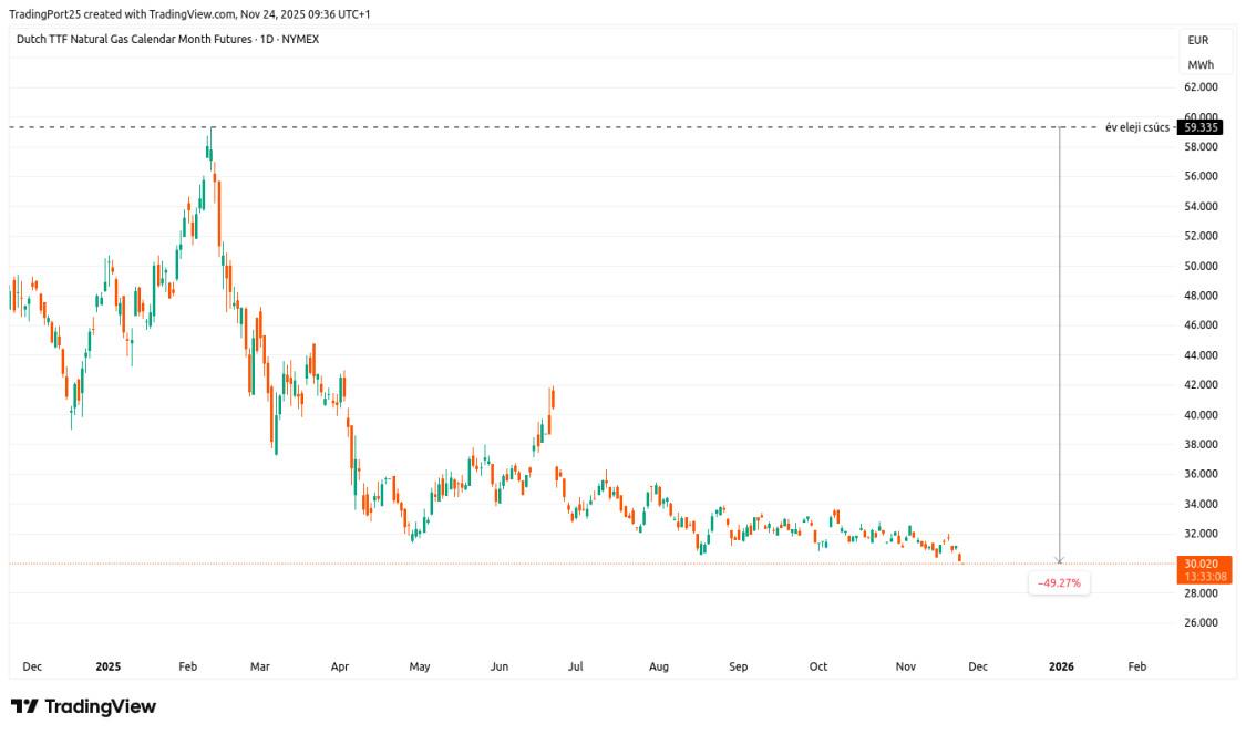 Az Európában irányadó TTF gáztőzsde következő havi árjegyzése hétfő reggel már 30 euró/MWh alatt is járt, ami azt jelenti, hogy az év eleji árjegyzéshez képest közel felére esett az európai gázár.