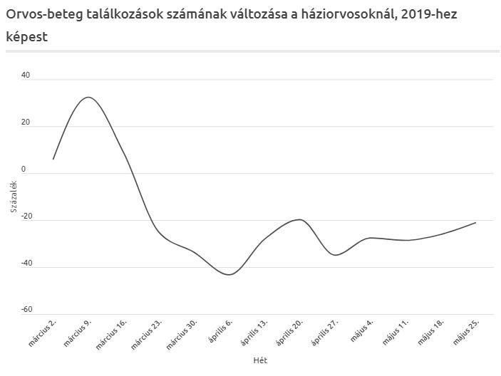 Jól látszik, hogy az orvos-beteg találkozások március 9. után drámaian visszaestek, és a 43 százalékos zuhanás után május végére is csak mínusz 21 százalékra tornázták vissza magukat. Másképp fogalmazva: a háziorvosi rendszerben a személyes találkozások aránya a járvány nélküli évhez képest 57 százalékra esett, és még mostanában is csak 80 százalék körül van.