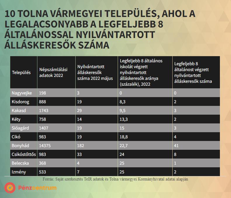 Tehát 2022-ben az ezen a 42 településen élő, mind az 9533, legfeljebb 8 általánost szerzett lakosról elmondható volt, hogy nem rendelkezett munkahellyel és nyilvántartott álláskeserőnek számított.