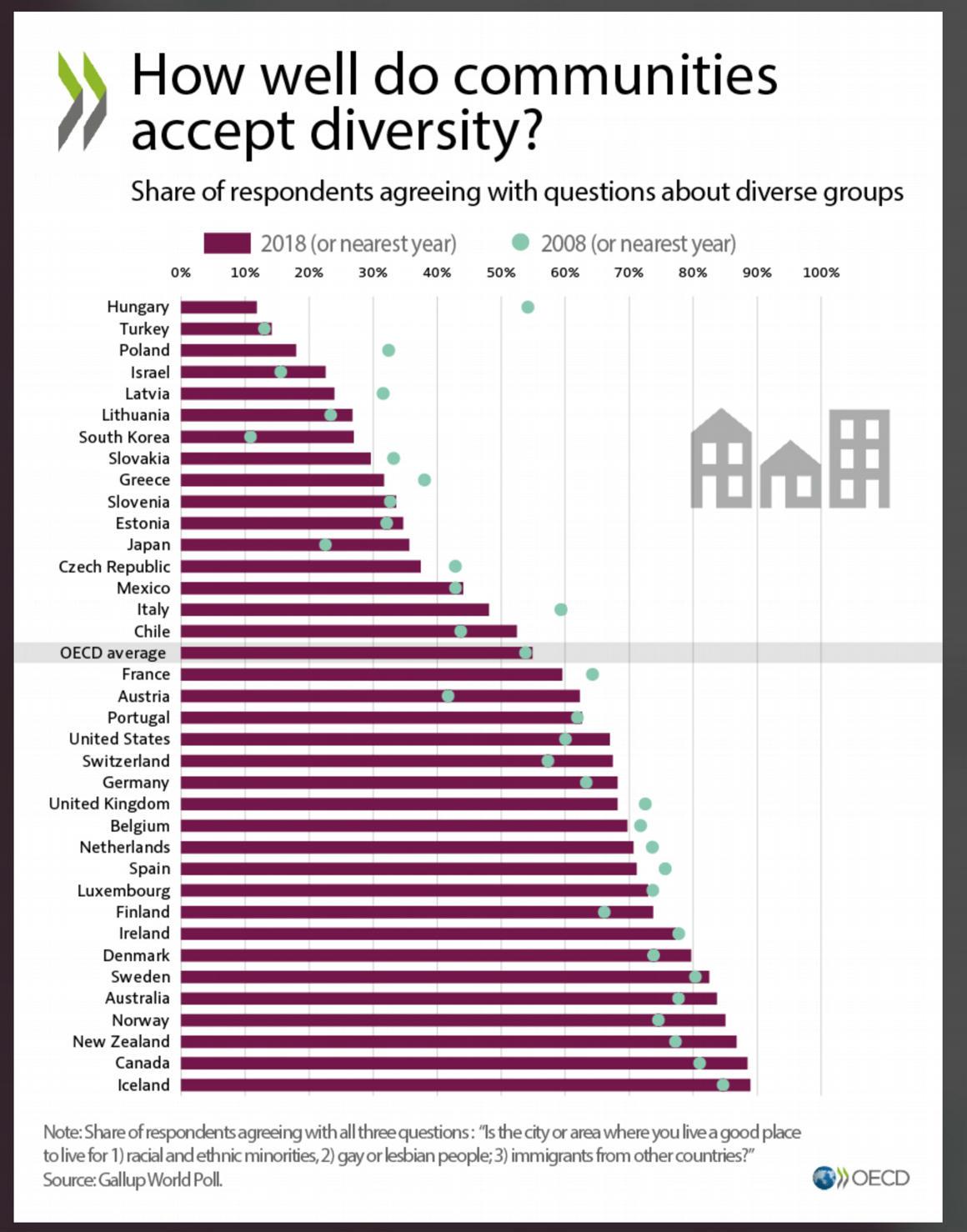 Sejthető volt, hogy a társadalom sokszínűségét és az azokhoz kapcsolódó attitűdöket tekintve Magyarország az OECD zárkózottabb tagállamai közé fog tartozni, de erre az abszolút rekordra azért nem lehetett számítani: a Gallup 2018-as reprezentatív felmérése szerint Magyarországon vannak a legkevesebben (a lakosság mintegy 12 százaléka), akik úgy gondolják, hogy városuk, környékük megfelelő lakóhely egy etnikai kisebbséghez tartozó, egy szexuális kisebbséghez tartozó, illetve egy bevándorló személy számára.
