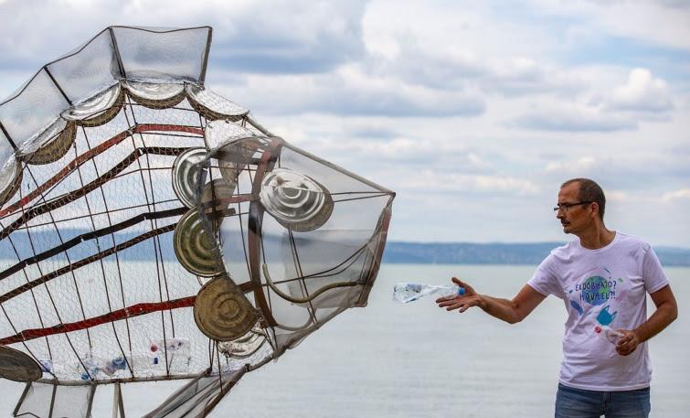 Aktivisták a Greenpeace Magyarország halat formázó installációját helyezték ki a siófoki nagystrandon 2020. július 17-én. A “Nagy Hal” egy fémhálóból készült üres szobor, amelybe bárki bedobálhatja az üres műanyag palackjait, poharait, így töltik fel a halat újrahasznosítható műanyagszeméttel. Műanyag palackot dob egy aktivista a Greenpeace Magyarország halat formázó installációjába: