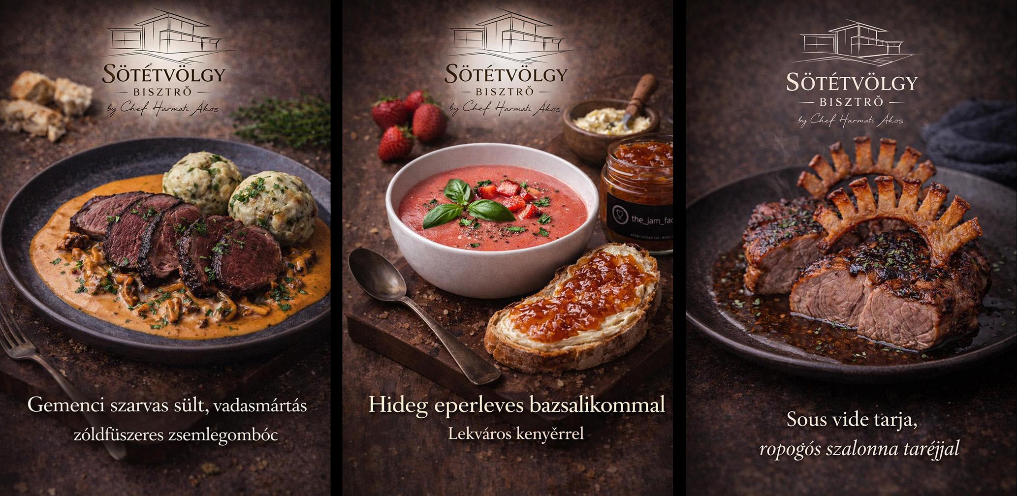 Az elnevezés is beszédes: a Sötétvölgy Bisztróban halat, vadat, házias ételeket, nyitáskor pedig grillételeket kínál majd a vendégeknek. Harmati Ákos elmondta, hogy a hagyományos, régi vidéki konyha ételeit főzi egy kis csavarral, modern köntösben. Nagy szerepet szán a kézműves termékek, helyi alapanyagok felhasználásának, hideg-és meleg ételeket egyaránt kaphatóak lesznek, emellett kézműves sütemények, kávékülönlegességek színesítik a palettát. Külön érdemes kiemelni, hogy a kínálatban szerepel majd a „smalec”, a töpörtyűvel, hagymával készített zsíros kenyér, de az ínyencek például szarvassültet is választhatnak vadas mártással. Az étlap szezonális ajánlatokat tartalmaz, a minőség és az alapanyagok a meghatározóak. Az ételeket lebomló, cukornádból készült tányérokon fogyaszthatják a vendégek, a környezetbarát szemlélet az üzlet elhelyezkedésében és kínálatában is garantált. Fontos elmondani, hogy a vendégteret fedett és nyitott terasz egészíti ki, az élményt pedig a tó, az erdő, a természet teszi teljessé.
