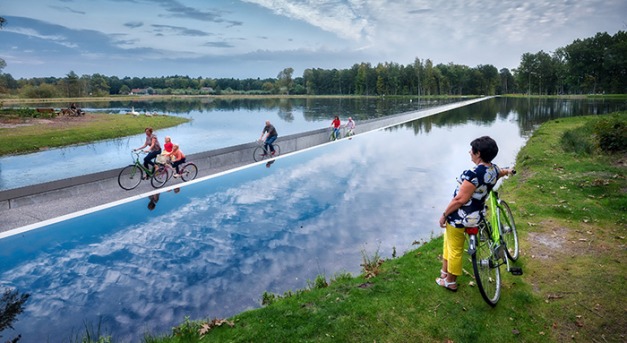 A belgiumi Limburgban, a De Wijers természetvédelmi területen a kerékpárút egyenesen keresztül vezet a tó vizén, ahelyett, hogy fölötte haladna el. A 212 méter hosszú, betonból készült utat a vízszint alá építették, így a kerékpárosoknak a tó felszíne szemmagasságban helyezkedik el.