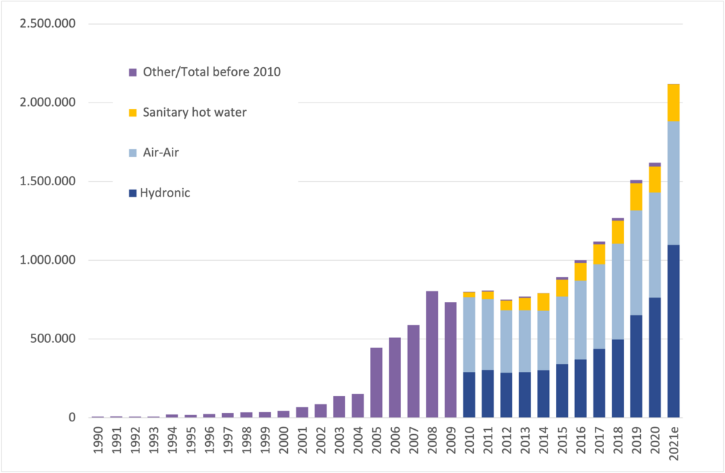 Nem csak Németországban volt látványos a növekedés. Európa 21 országában tavaly 2,2 millió hőszivattyút telepítettek, szemben a 2020-as 1,6 millióval - ez 14%-os piaci részesedésnek felel meg - az összesített számuk így év végére már elérte a 17 milliót.