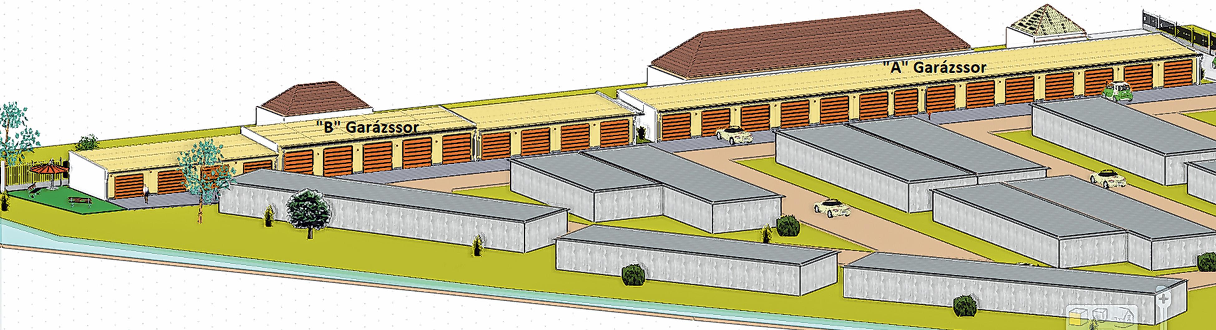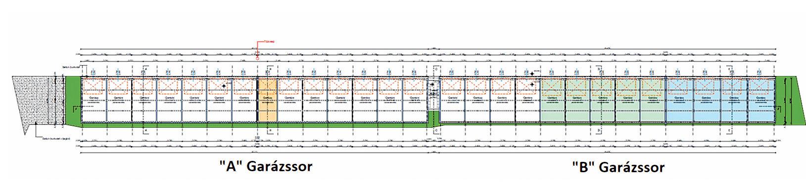 Az „A” és „B” garázssor két lépcsőben kerül kivitelezésre. Az első ütem „A” garázssoron 14 db, és a második ütem „B” garázssoron 13 db garázs épül.