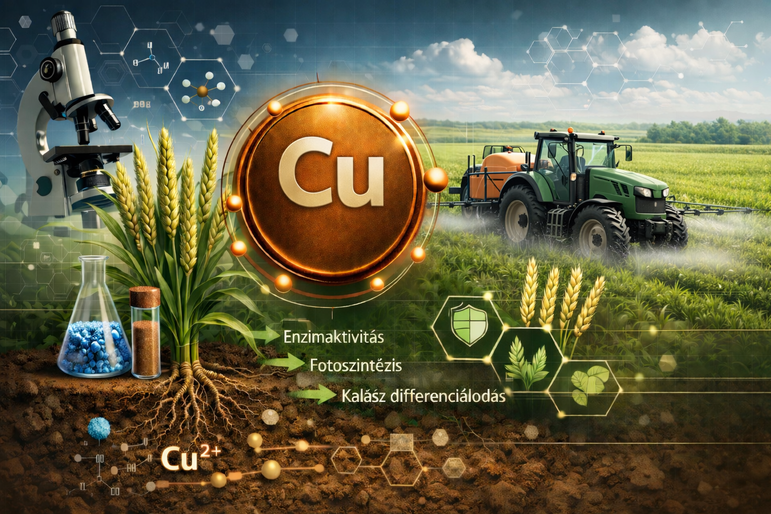 1. Fotoszintézis és energiaforgalom. A réz a plastocianin nevű fehérje alkotórésze, amely a fotoszintézis elektrontranszport-láncának kulcseleme. Hiányában romlik az elektronáramlás hatékonysága, csökken a fotoszintetikus aktivitás, ami közvetlenül visszaveti a biomassza-képződést és a termésalap kialakulását.